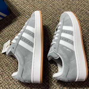 Classic Adidas Campus sneakers. Features gray suede with white stripes. Iconic logo on tongue.