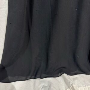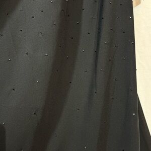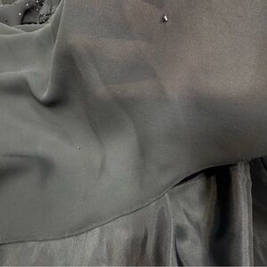 Classic and chic, black beaded long evening dress. Beading is heavy at the top and gradually lessens but beads go down to the hem. Sheer outer layer with the beading and fully lined with black satin. The dress gradually flairs from the chest to the hem. Perfect for cocktail party, black tie wedding, or other formal event. Spaghetti straps with a scoop neck. Fully lined.