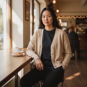 This versatile cardigan offers a lightweight feel and timeless design, ideal for layering in professional or casual settings. Its neutral camel tone complements various outfits.