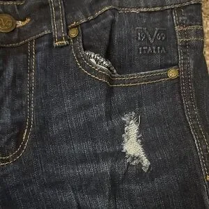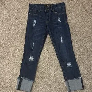 Stylish dark blue jeans with distressed details. Perfect for casual outings.