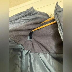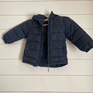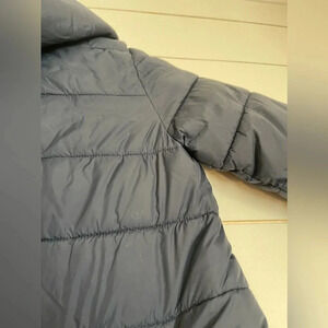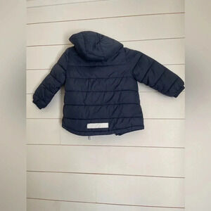 Padded jacket in water-repellent woven fabric with a padded, detachable hood. Stand-up collar, zip at front with chin guard, and side pockets with snap fastener. Reflective details. Partly lined in fleece. Water-repellent coating without fluorocarbons.