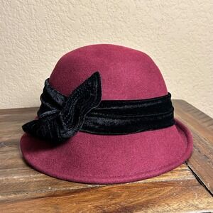 Keywords: cloche, felt, burgundy, velvet bow, vintage style, womens hat, fashion accessory, tea party, formal wear, winter hat, fall fashion, elegant, classic