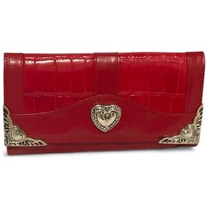 EUC Designer Inspired Croc Embossed Red Leather with Silver Tone Metal Decorative Heart and Edge Details.