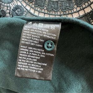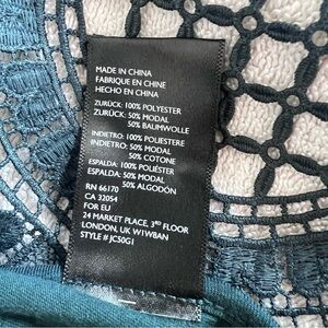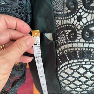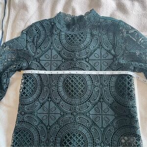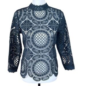 Elegant navy lace blouse by designer James Coviello for Anthropologie. Intricate circular patterns. Long sleeves with scalloped edges. Perfect for special occasions. Wear over a tank top.