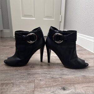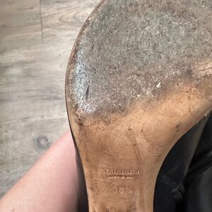 Gucci Bootie Heels with Peak Toe are perfect for fall and spring! These timeless boots are great with jeans or a beautiful dress. Please note the boots are in good condition but there is wear on the stem of the heel on the inside and has been documented in the photos. Also, a little wear on the front of the toe bed but easily covered with polish. New tips were just added to the boots. Gucci dust bag also included.