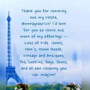 Do you know how to bundle? I offer 15% off every item if you buy two or more items from my closet! You also only need to pay shipping ONCE on a bundle -- up to 5 lbs per order. It’s a win-win! To bundle, tap on the shopping bag icon under each item you’d like. Posh will combine all those items into a single bundle, automatically deduct the 15% discount, and combine the shipping. If you send me a bundle, I will offer an even higher discount to you!