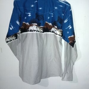 Stylish button down with a unique western print. Features a blend of blue and gray tones. Ideal for casual wear.