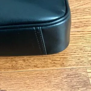 Sleek black leather design. Ideal for business or travel. Features sturdy handles and a detachable strap.