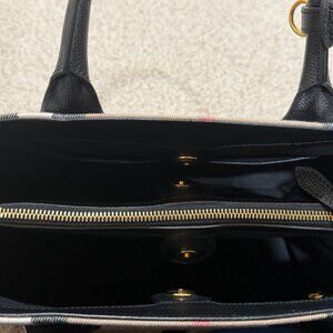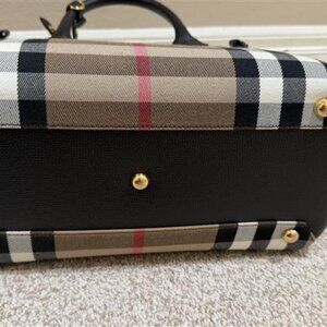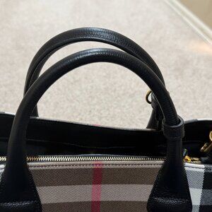 Classic Burberry tote bag featuring the iconic beige check canvas with black leather trim and gold hardware. Structured silhouette with top handles and a detachable adjustable shoulder strap for versatile carry. Spacious interior perfect for everyday use, work, or travel. Timeless Burberry style in excellent condition — a chic statement piece that instantly elevates any outfit.