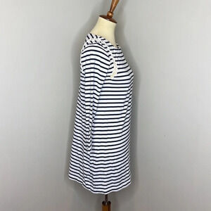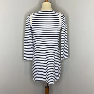 This is a lovely dress by A.L.C., size S. The dress is white with dark blue stripes. It has long sleeves. The dress has lace-up details on the shoulders. It is in great, pre-owned condition with no rips, stains, or tears.