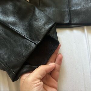 These are high-rise trousers with a removable tie belt that cinches your waist. They're made with our Vegan Stretch Leather — a soft, supple vegan leather that looks and feels like the real thing. Very comfortable and chic! In great condition - one of the leg seams unraveled. Size 8.
