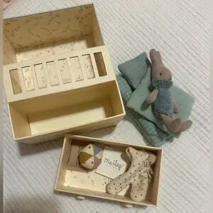 Adorable Maileg bunny with cozy bedding and accessories. Missing bottle.