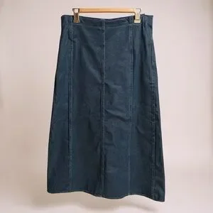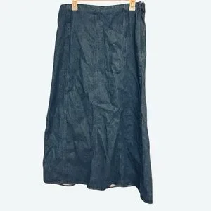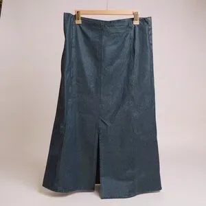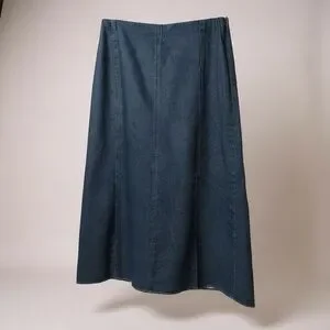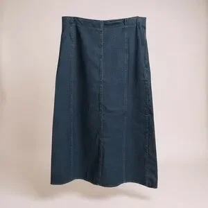 Chic dark blue denim A-line midi skirt by Reclaimed Vintage. Dark blue hue. Slit in back. Side zipper closing with hook and eye. Perfect for versatile styling. Size 10