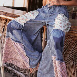 Multicolor Boho Women's Style Country Patchwork Plaid Loose Wide-Leg Casual Jean