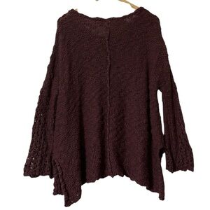 Nubby and cozy cotton oversized sweater, featuring an open-knit vee neckline, bell sleeves, and a ribbed, asymmetrical hem. Effortless shape.