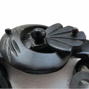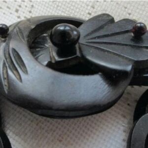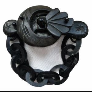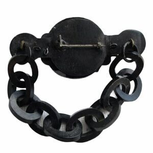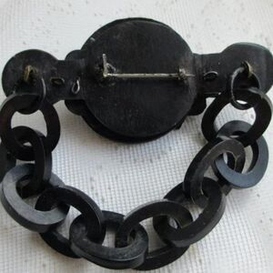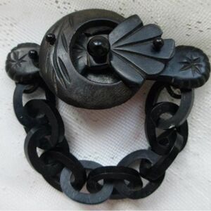 This unique piece is an antique victorian mourning pin or broach featuring a buckle with chain which dates to the mid to late 1800’s. This hand-carved pin is made of gutta percha wood and glass beads and is in excellent condition for it's age. The pin measures 3 1/4” by 1 3/8” by 1/2” and has an antique ‘C’ clasp closure.