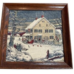 Vintage, Kay Dee, Linen Art, Farmhouse Decor, Winter Scene, Handprint, Wood Frame, Collectible Art, Wall Decor, 1950s, artwork, vintage prints ,