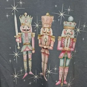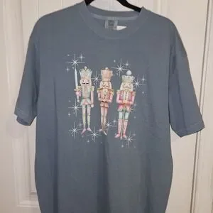 Blue t-shirt featuring a colorful nutcracker graphic. Perfect for casual wear. New, XL comfort colors in Ice Blue.