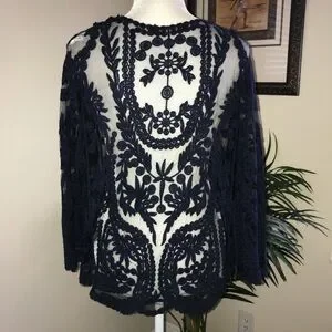 Origami By Vivien Long Sleeve Navy Sheer Lace Womens Top S