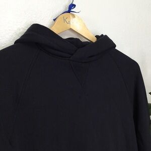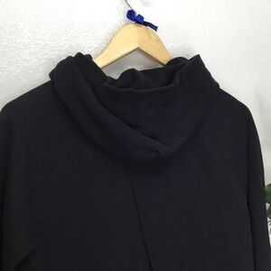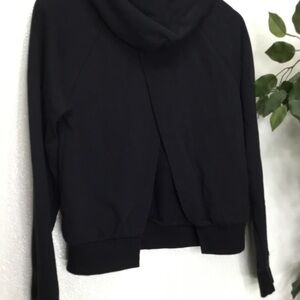 A comfy, medium weight black hooded sweatshirt. Big pocket on the front and an open criss cross back. Cuffed sleeves and front bottom.