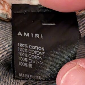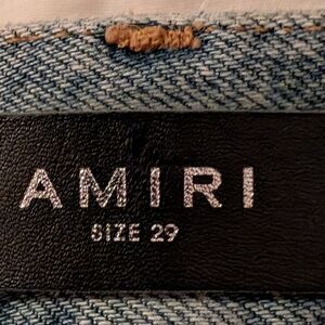 Stylish relaxed fit jeans. Light blue wash with distressed hems. Perfect for casual wear. All pockets are riveted. all seems internally are double triple stitched and aligned leather and brand tags on the back and on the inside and button fly button are all branded as well as amiri branded back pocket logo materials from Paris and Japan all assembled in Los Angeles