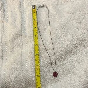 This stunning necklace features a red apple pendant, perfect for adding a touch of elegance to any outfit. The silver chain complements the vibrant red, making it a versatile accessory for any occasion.