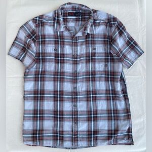 Stylish plaid shirt with button-down design. Features short sleeves and chest pockets. Perfect for casual outings. Great for layering or wearing on its own. Layered design is meant to keep you cool on hot days. In good used condition with no apparent flaws, holes or stains.
