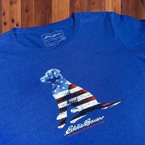 Classic Eddie Bauer women’s graphic tee in blue, featuring an adorable dog and American flag design. Soft cotton feel, perfect for casual wear, patriotic style, or dog lover outfits.