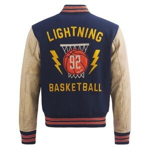Stylish varsity jacket with navy body and tan sleeves. Features bold red accents and classic design. Perfect for casual wear.