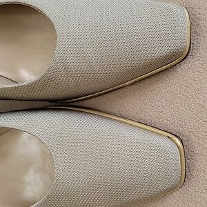 Stuart Weitzman taupe and gold slip on pumps with leather soles. Fabric upper in a textured taupe with gold tones. Squared toe box. Gold trim. A gold 2” block heel and gold trim accent. Made in Spain. Size 9B EUC no box or dust bag.