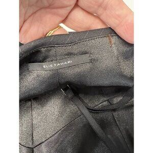 This listing is for one Elie Tahari Sweetheart Neckline Mini Dress~Size 2~Black Pin Striped Dress that is in good, pre-owned condition. Tiny hole (in dress not lining) and two small "pulls" - all shown in pictures. Hard to see unless you know they are there. Wool/Elastane. Dry clean.