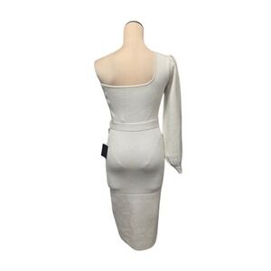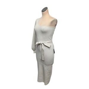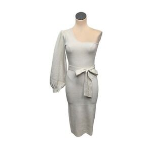 Lulus Dress Womens Medium White One Shoulder Midi Knit Metallic Belted Party S
