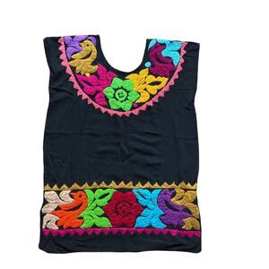 Handmade Mexican Embroidered Black Blouse Tunic Top Birds Flowers Artisan
