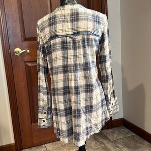 Button up front with lacing detail. Frayed at neckline, Flannel material, long sleeves.