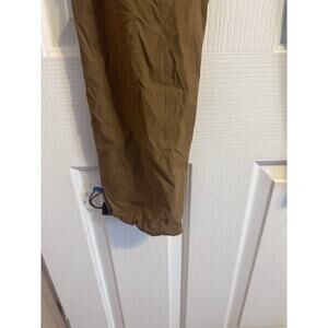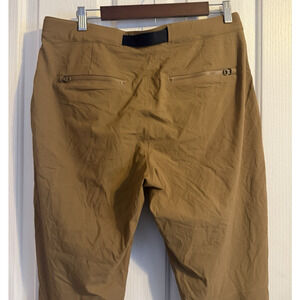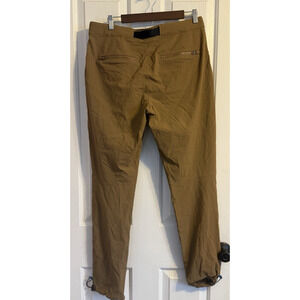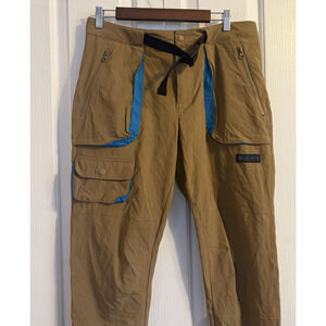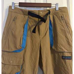 Columbia men’s lightweight nylon hiking/outdoor pants in tan with bright blue contrast trim. Size 32 Regular. Durable, quick-dry nylon fabric with added stretch for mobility. Features zippered pockets, cargo pocket, and adjustable hem cinch cords. Ideal for hiking, fishing, camping, travel, or everyday outdoor wear.