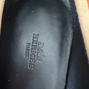 Elegant beige Hermes icon suede loafers featuring a stylish gold buckle. Perfect for any occasion. Size 39