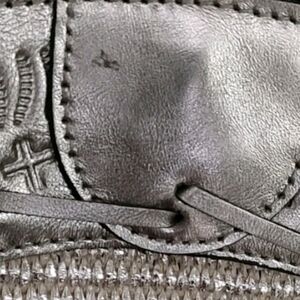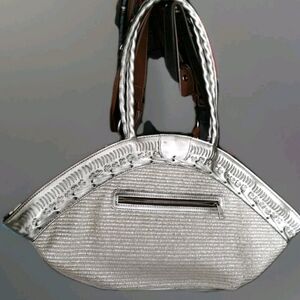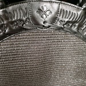 Patricia Nash Trope Raffia Dome Style Tote with Tooled Leather Trim Tassels Zips