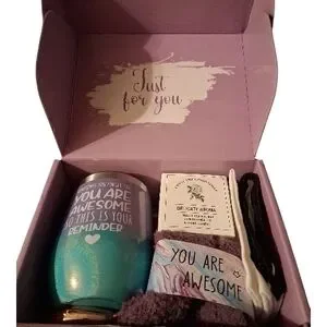 Includes stainless steel insulated wine cup with stainless steel straw and cleaning brush, handbag mirror, cozy warm socks, small zippered carrying bag perfect tonstore make-up (or snacks!) and a soywax candle.