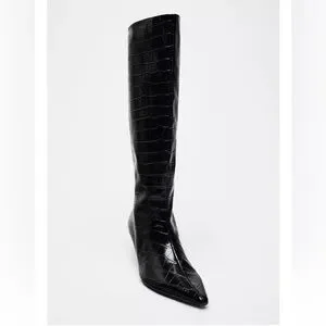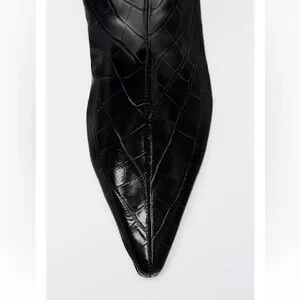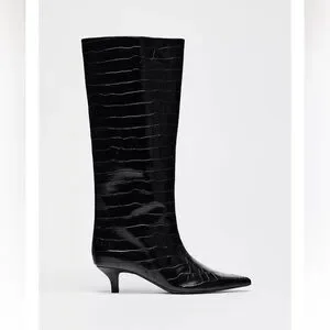 Wide shaft with faux patent finish and mock croc upper. Kitten heels.