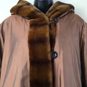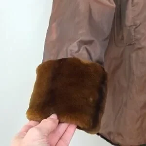 Beautiful, but unfortunately too large for me, since I am a size 10. Tafetta shell with good quality faux fur. Clean and fresh.