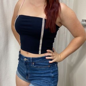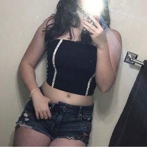 Super sexy and fun top. It is a cropped strapless bandeau/tube top. Worn only a few times, good condition with minor wear. Very cute shiny gem/jewel/rhinestone embellishments lining the front in two lines. Stitching of the tag can be seen slightly on the back of the top. The inside of the top has a rubber like lining to secure the top so it doesn’t fall. Perfect for going out, bar nights, clubbing, dinner dates, and many more!