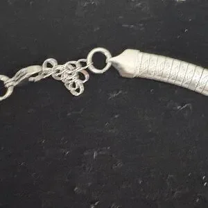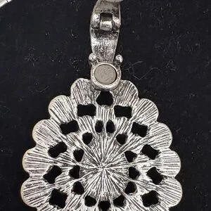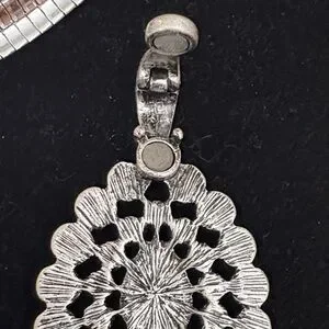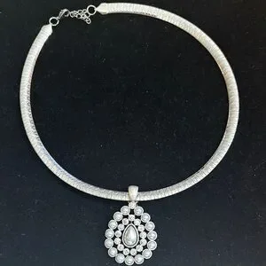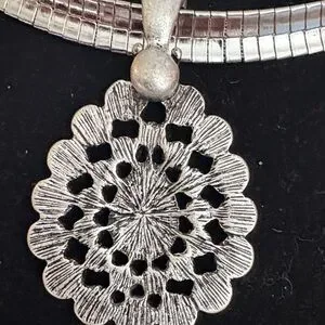 This stunning silver necklace features an intricate pendant design, perfect for adding elegance to any outfit. Ideal for special occasions or everyday wear.