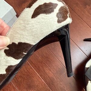 New and in original box. Made in Italy these gorgeous stiletto pointy toe heels are a slip in style. Black leather bow at the front. Complete leather upper as well as interior with the exterior is hair on cowhide with a red brown natural coloring as well as white. European size 38, which equals about a size 8 US and 37 = 7.5 please know your sizing in this brand. Heel is 3 inches high. Very stylish and a super luxury brand. Please note that these shoes were floor model and they are new and in the box however they have been tried on in the store. No damage to the shoes.