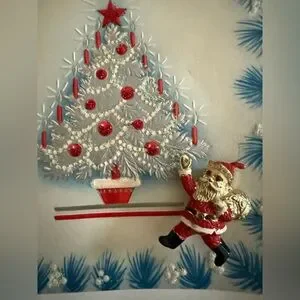 Vintage Adorable Festive Merry Christmas Card with Tree Design and Santa Brooch