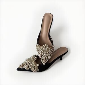 Kitten Heels Slip On Poeticka Womans Pearl & Lace Gems Sz. 7.5 EU Sz. 38. These gorgeous embellished shoes are perfect for any party or holiday. Be the beauty at any ball with these pearl look beaded shoes, trimmed with sparkling stones and gold accents then covered in black lace. Very elegant.