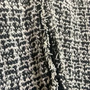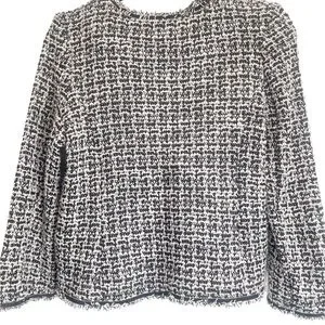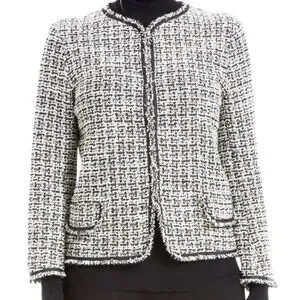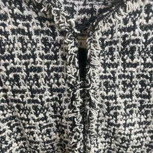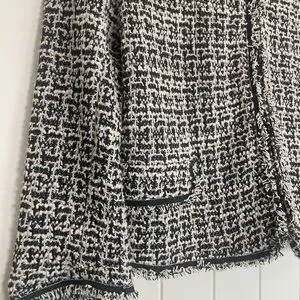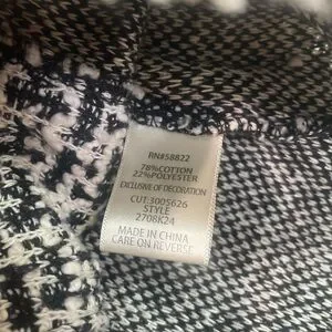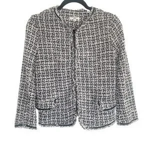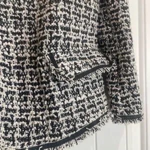 Black trim and a slight fringe detail along the bottom hem and cuffs Three hooks to close the center. Front pockets are not functional.