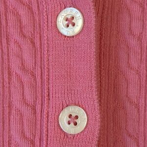 Vintage Lauren Ralph Lauren Pink Cotton 3/4 Sleeve Polo Pullover Sweater Tee. Four-Button Placket. Vertical Cable Ribbed Design. Scallop edged collar. Lightweight and soft. Side vents at hem. Made in USA.