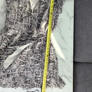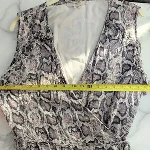 V neck with ruffle trim around shoulders and hem. Wrap dress. Sleeveless. Allover snake print. Viscose