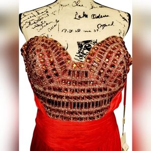This exquisite gown by Angela & Alison features a tiered, embellished design with a sweetheart neckline, perfect for a prom night. The dress showcases a beautifully adorned bodice with intricate gold embellishments, adding a touch of elegance. Its flowing skirt creates a captivating silhouette, making it an ideal choice for a memorable evening.