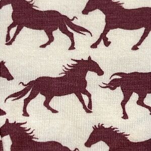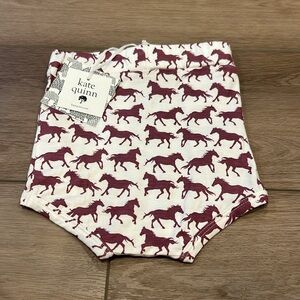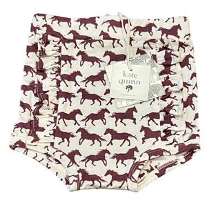 Kate Quinn bloomers/diaper covers in NWT condition. Maroon and white, horse pattern, western, size listed is 12-18 months. Made from bamboo blend. Material feels wonderfully soft.